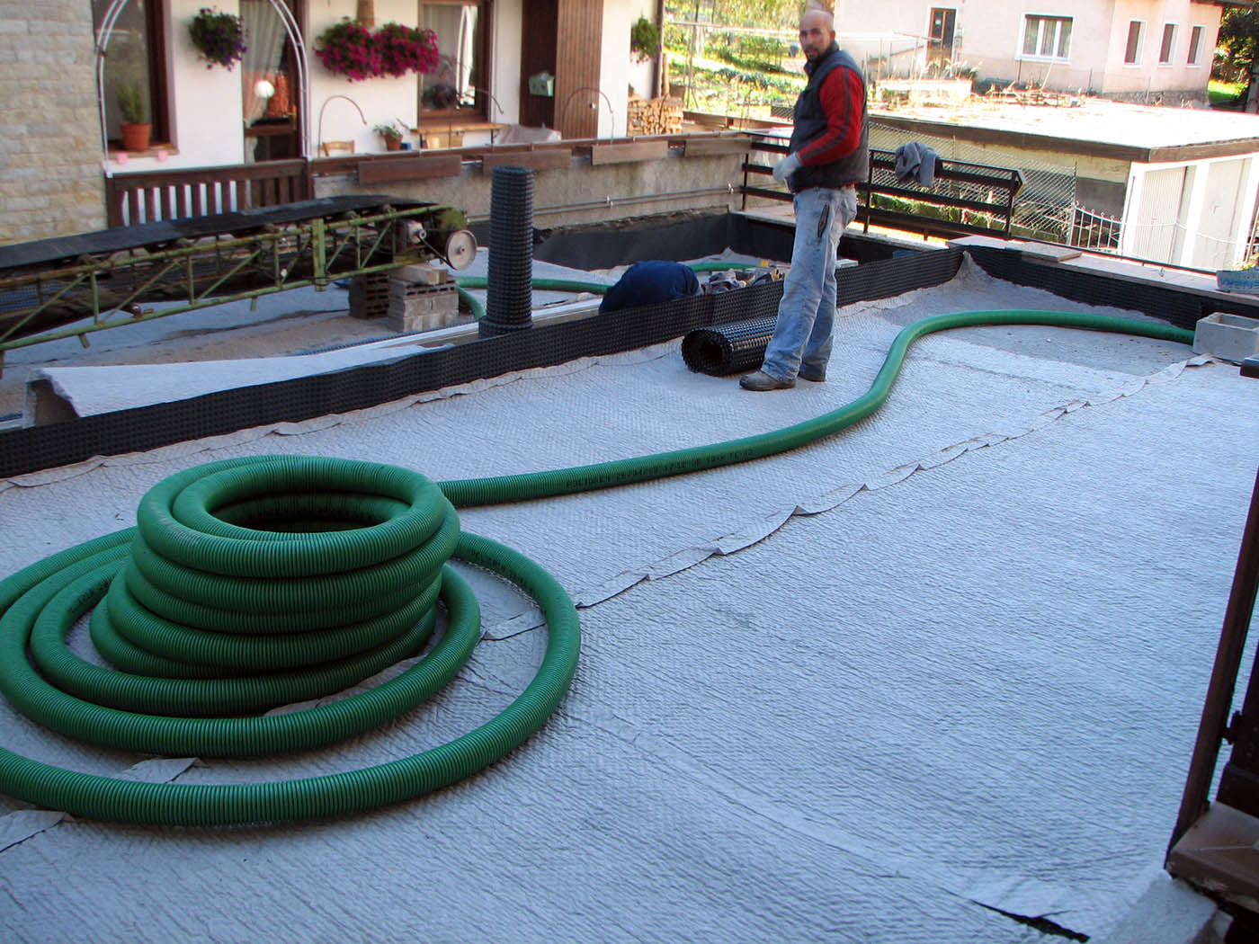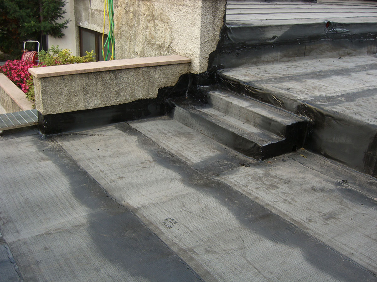 Abbiamo applicato le guaine (necessariamente in doppio strato) con i giusti risvolti, senza interruzioni ma con uno sviluppo completo a copertura di strutture, muretti e scale.
